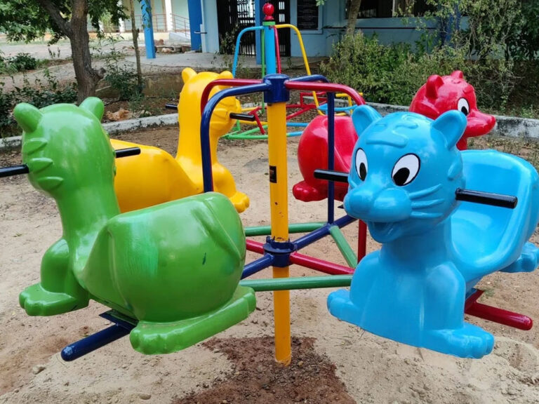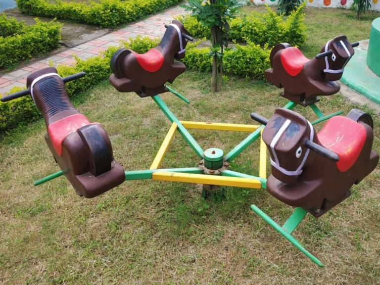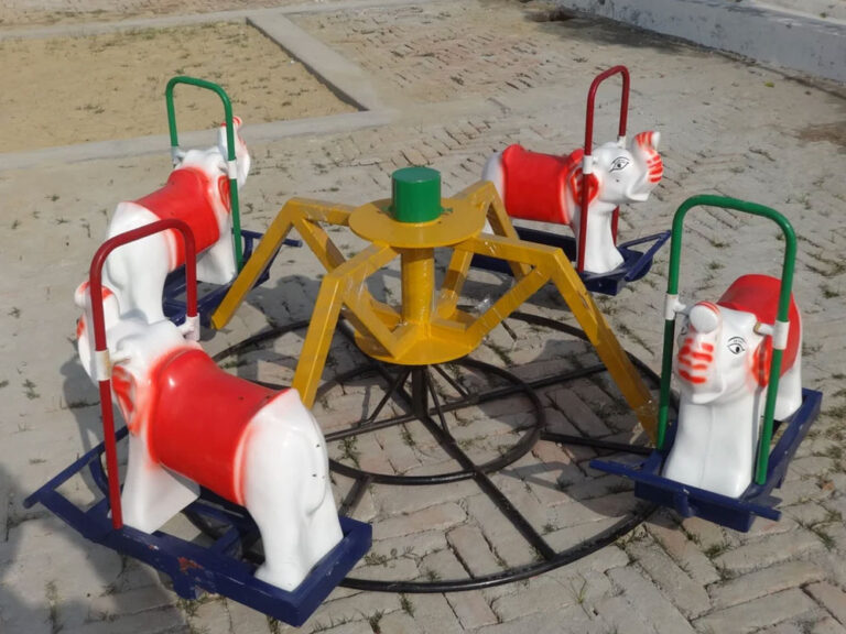 An Animal-Type Merry-Go-Round is a rotating playground ride featuring animal-shaped seats mounted on a circular platform. It allows children to sit on horses, elephants, lions, or other animals while holding onto handles for support. The structure spins around a central axis, either manually or mechanically.